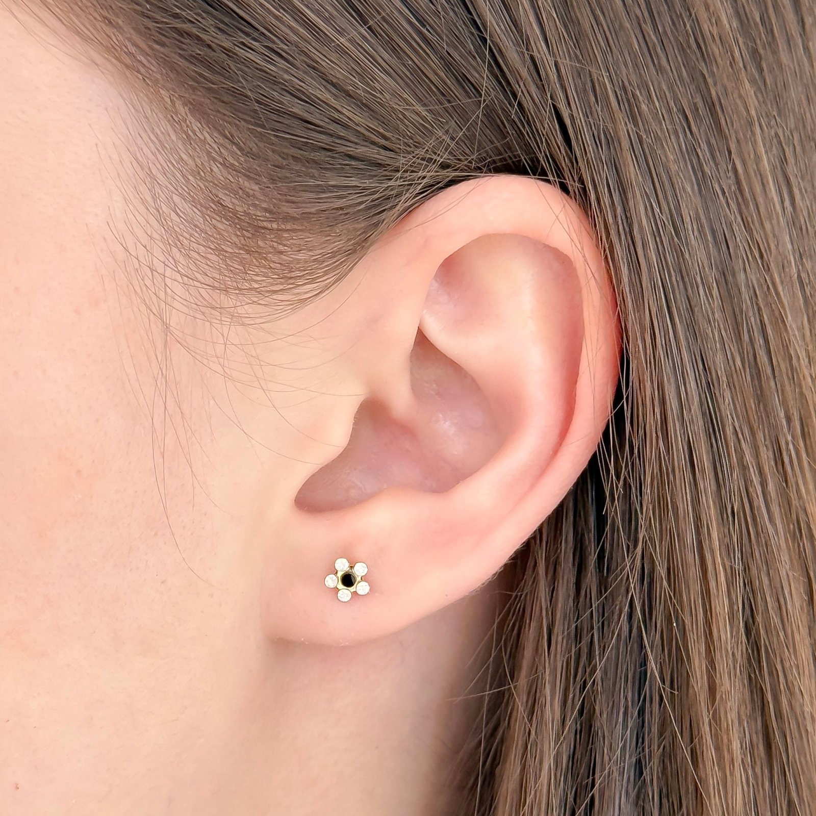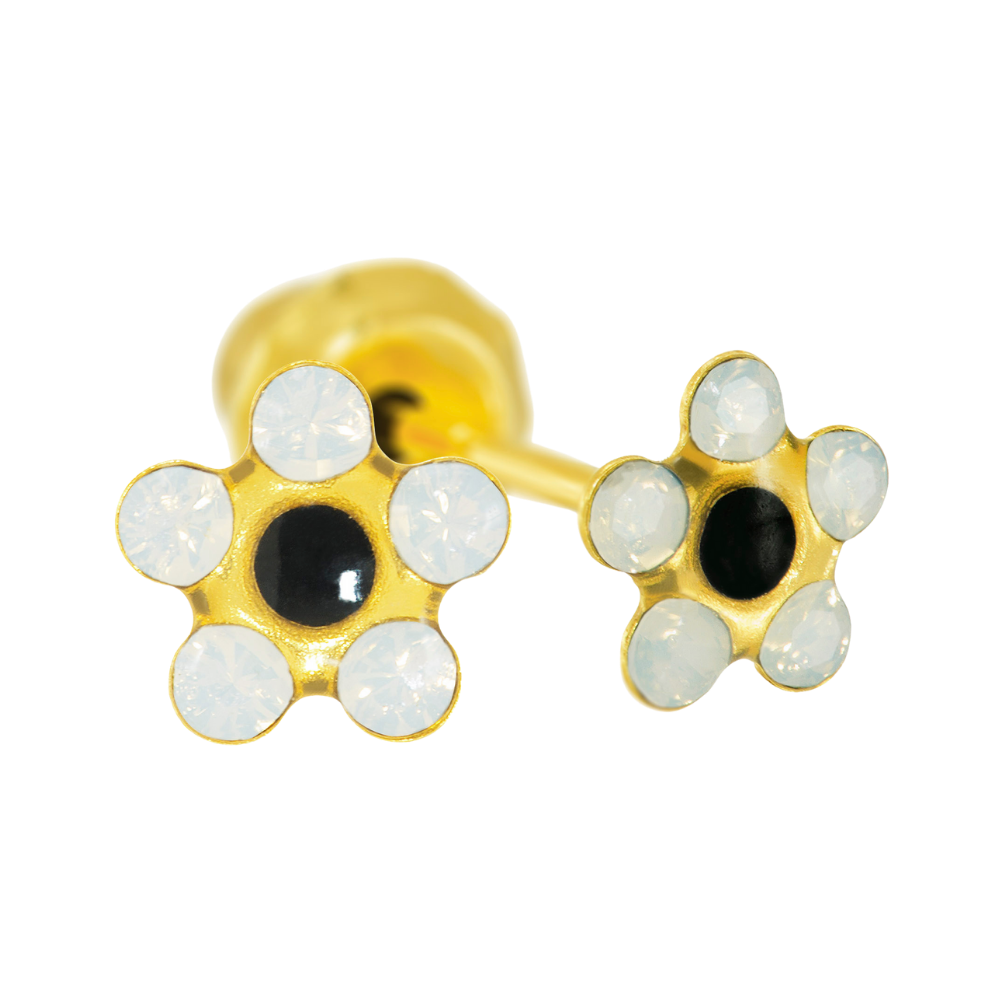 Arete de acero de grado quirúrgico con baño de oro de 24kt y broche ortopédico a presión o Safety Back™ patentado por la marca.