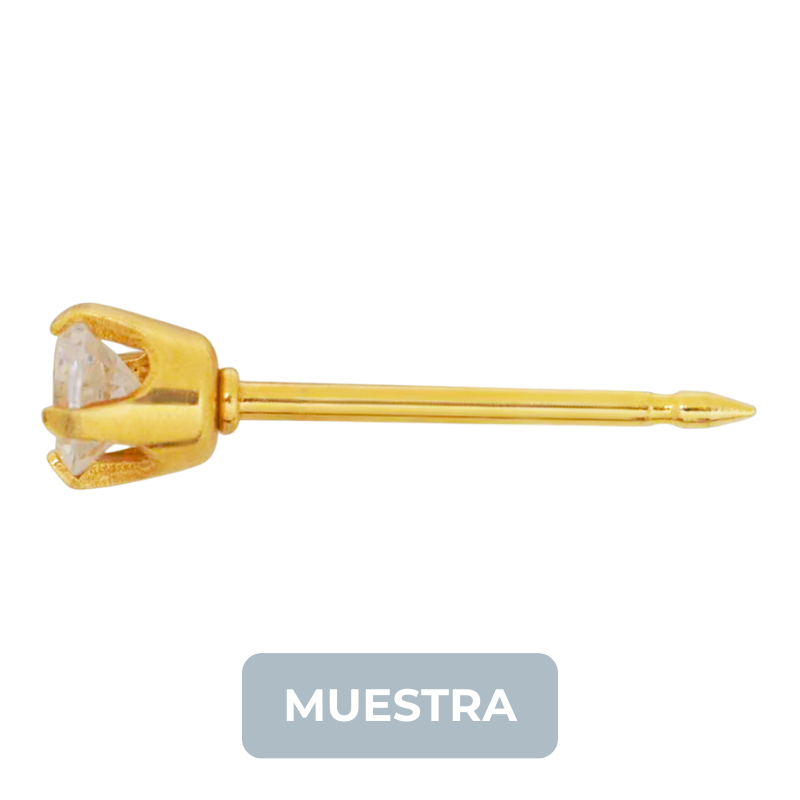 Muestra de arete de acero de grado quirúrgico con baño de oro de 24kt y broche plástico.