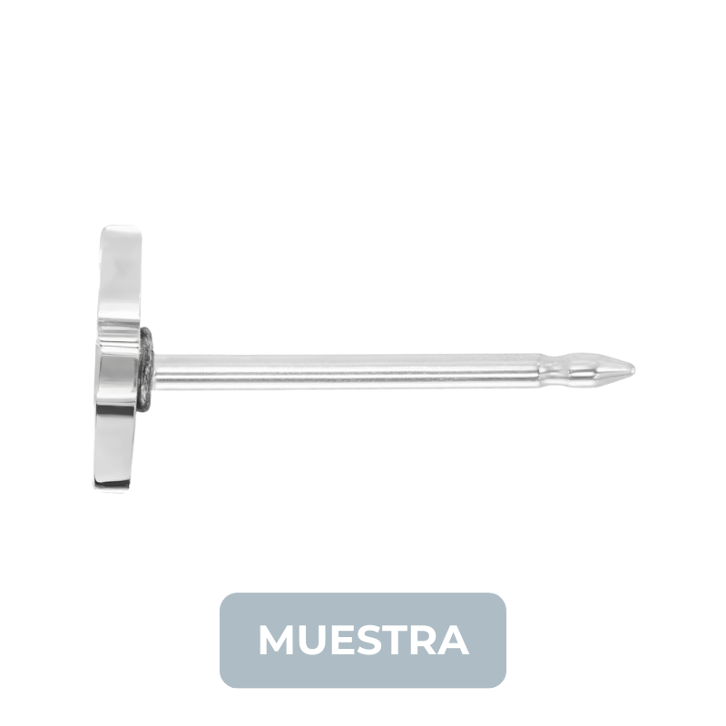 Muestra de arete de acero de grado quirúrgico y broche plástico.